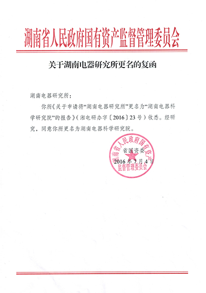 湖南電器研究所經國資委批復于2016年12月1日更名為湖南電器科學研究院。